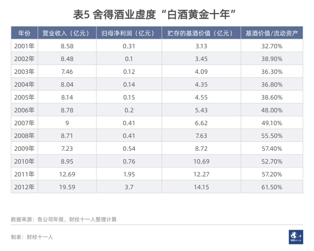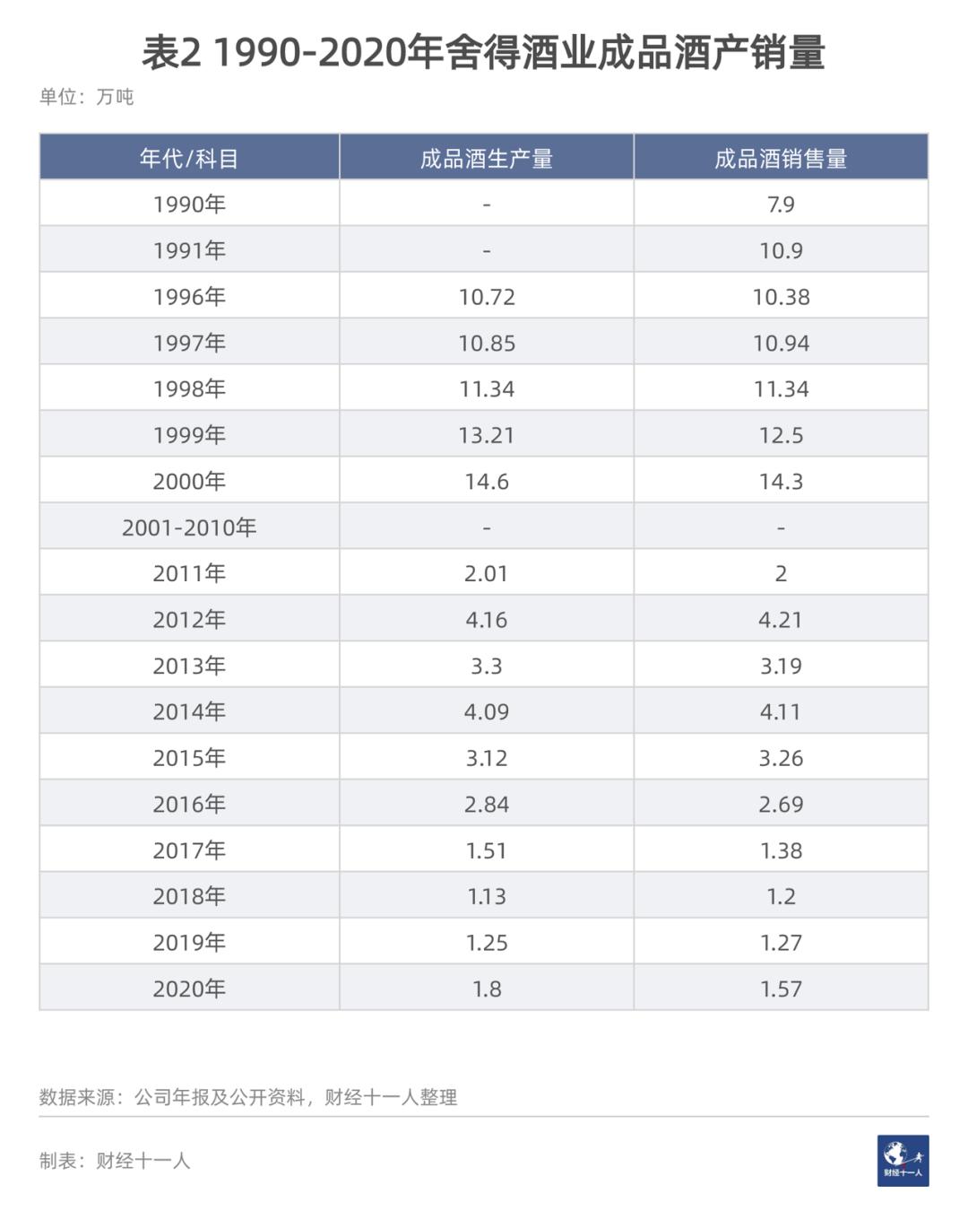 2001年,白酒执行新消费税,从价兼从量征收,沉重打击了以量取胜的舍得酒业。2001-2010年,舍得酒业连续10年未发布成品酒产销量,更无从知晓其的真实基酒产量。