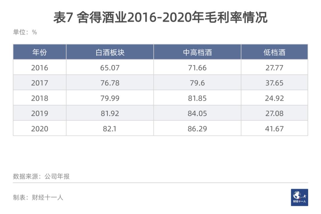 短短五年,因为产品普遍涨价、中高档品销量大增,舍得酒业的毛利率大幅攀升,见表7、表8。