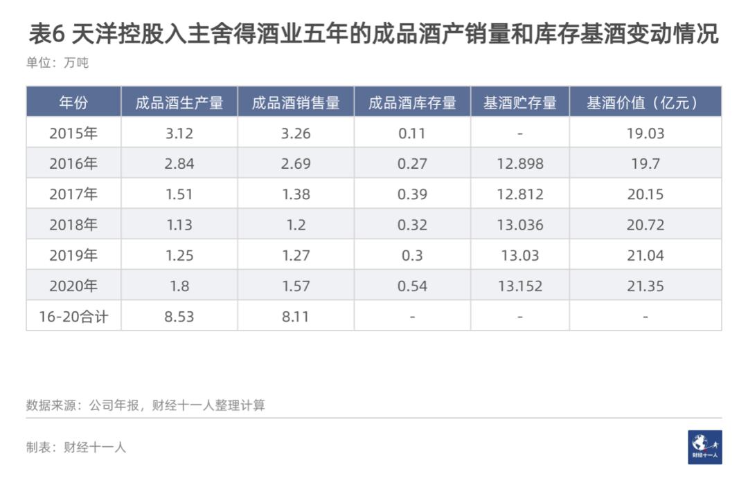 从表6可以看出,2016-2020年,舍得酒业共生产成品白酒8.53万吨,即天洋大约动用了5.7万吨(8.53/1.5=5.7)的“存量老基酒”。