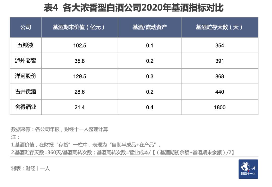 浓香型基酒的老熟期1-3年为佳。超过三年,缔合反应基本中止,酯降酸升加剧,反而影响口感。表4中,舍得酒业的基酒贮存天数,高达1800天(5年)。