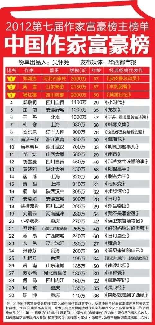 而到了2012年,获得诺贝尔文学奖之后,莫言轻松以2150万,升至中国作家富豪榜的第二位,这也证明了诺奖效应的“魔力”。