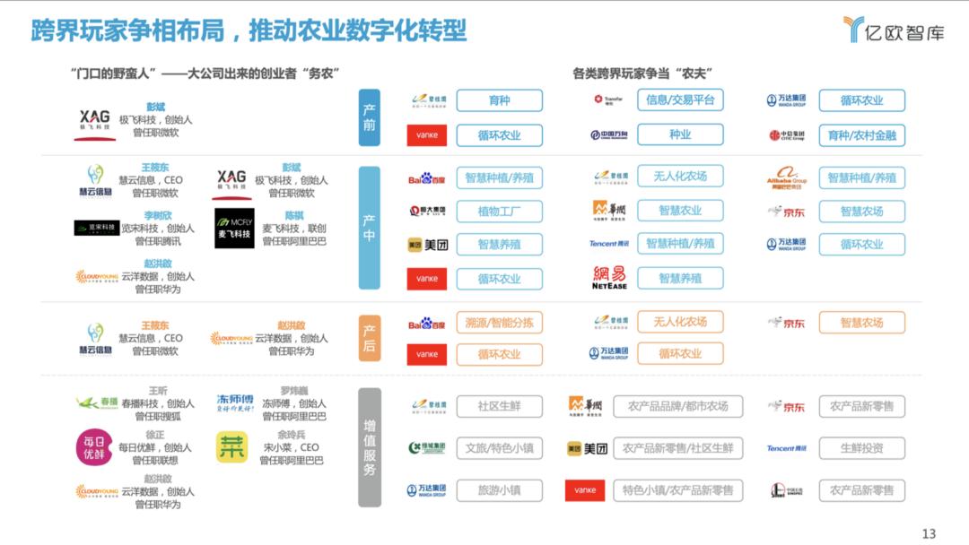 随着“数字中国”、“乡村振兴”、“数字乡村“等战略的部署,各大互联网企业、房地产企业、金融企业等跨界玩家纷纷参与其中,结合自身优势在农业领域争相布局,为我国“三农”发展献计献策;同时,许多从大公司出来的创业者也进军农业,将自身科技创新优势应用于农业领域,推动农业数字化转型。