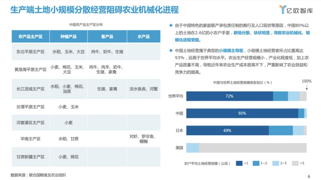 中国传统农业特色的家庭联产承包责任制的推行及人口现状等因素导致中国80%以上的土地在2.6亿的小农户手里,耕地分散、块状明显,导致农业机械化、规模化进程受阻。国内小规模土地经营者所占比重高达93%,远高于世界平均水平,土地经营属于典型的小规模主导型。这些原因导致近年来农业生产成本居高不下,严重影响了农业效益和竞争力的提高。