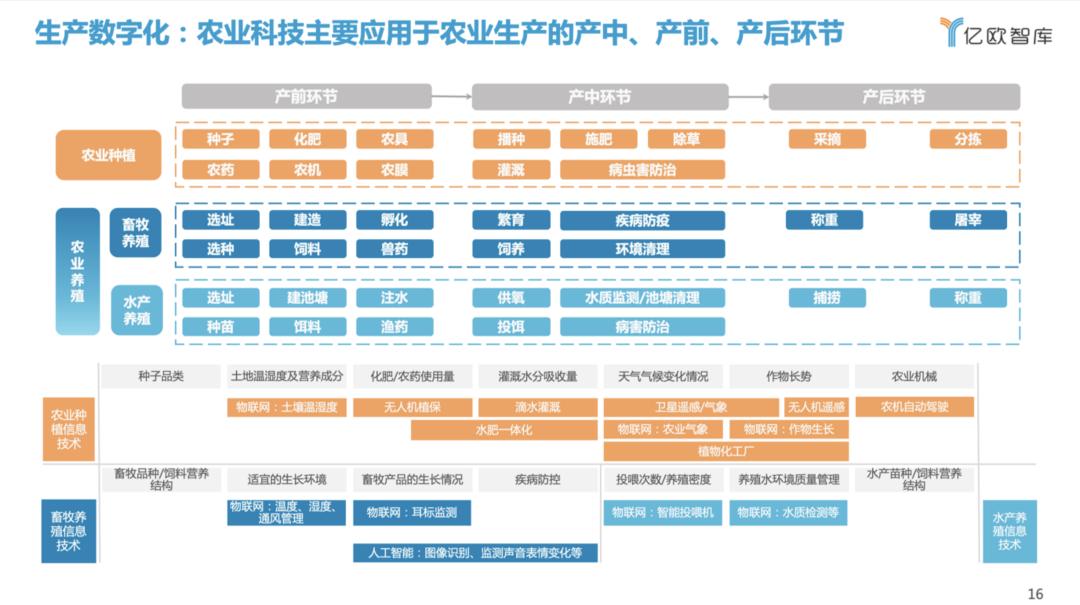 针对农业种植和农业养殖中的畜牧、水产养殖,现代信息技术可被广泛应用于生产过程中的前、中、后环节。