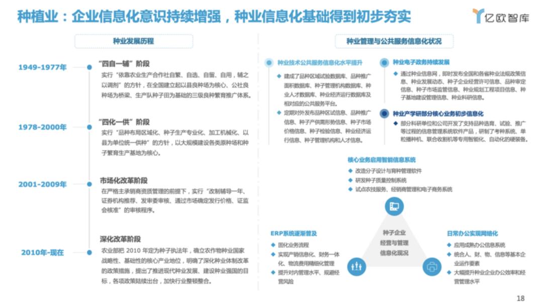 我国种业历经各个阶段的发展,目前处于深化改革期。各种子企业信息化意识增强,不仅在核心业务启用智能信息系统,日常办公也通过善用ERP系统等实现网络化;同时,种业技术与公共服务也向着全面信息化不断迈进。