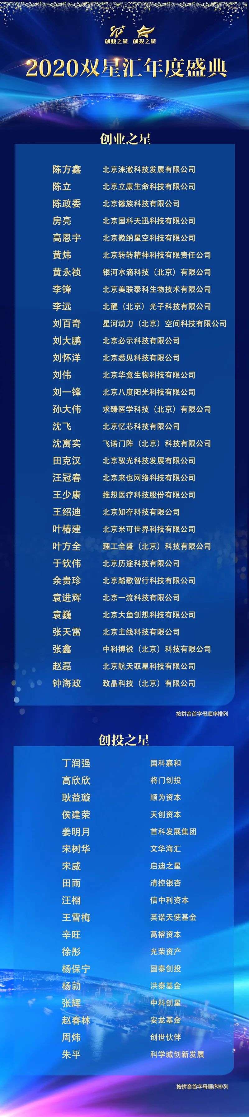 “双星汇”年度盛典系列活动包括“创业之星”和“创投之星”,合称为“双星汇”。2020年在原有活动的基础上全新升级,通过考察创新能力、管理能力、融资能力、社会影响力等多个维度,最终甄选出49位最具代表性的创新创业企业家和优秀投资人。