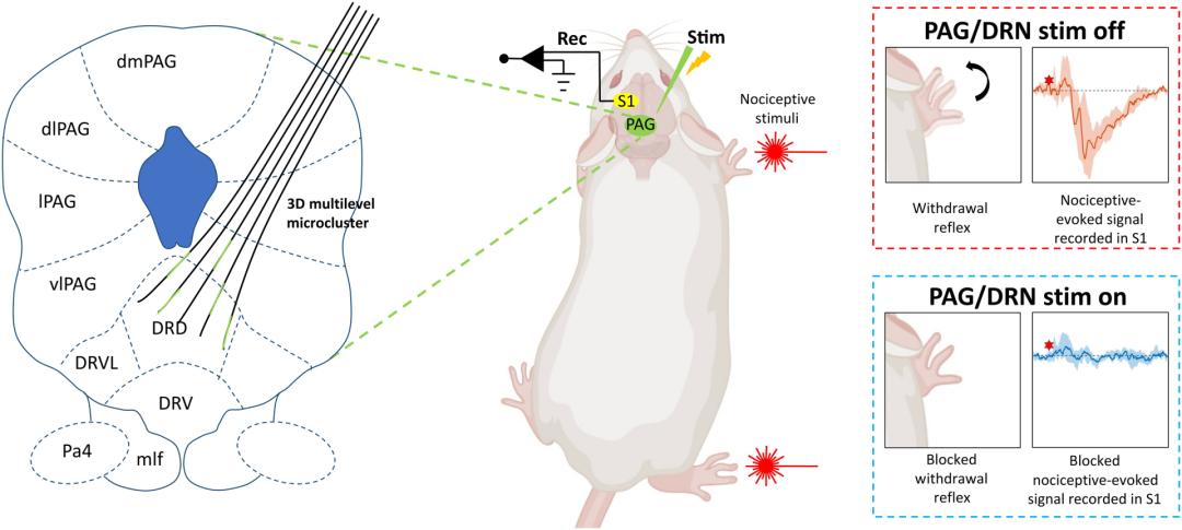 为了解决以最小的组织反应完成精确的大脑刺激的问题,研究者开发出将高度灵活的超薄微电极插入深部大脑目标的方法。通过嵌入在针形、硬明胶微电极即植入期间膨胀,然后溶解,高度灵活的微电极可以被植入并摊开在深部脑靶。在本研究中通过引入去绝缘触点的多级位置进一步开发了这种设计,目的是在包括 PAG 和 DRN 的体积中提供刺激位点,从而为神经组织在三个维度 (3D) 中的微调、颗粒刺激提供新的范例。值得注意的是,集群设计还减少了事先不知道适当刺激部位的精确位置的问题。