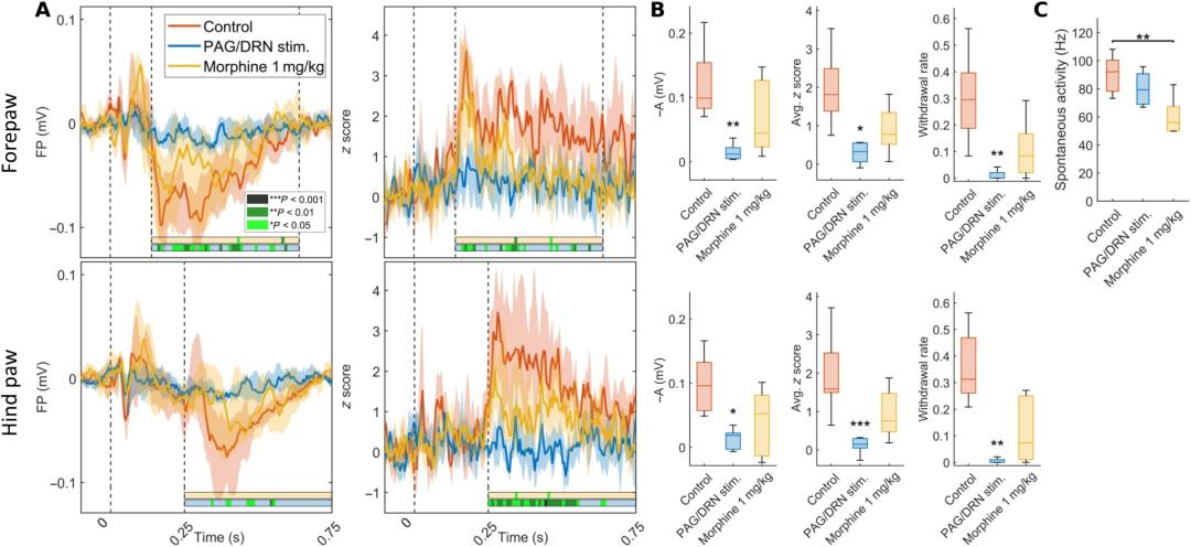 据论文数据,研究者比较了 PAG/DRN 刺激与吗啡(1 毫克/千克,皮下注射)在相同动物(n = 8)中在第 4 至 5 周期间对相同动物(n = 8)的镇痛作用,以衡量 PAG/DRN 簇刺激的镇痛效果。吗啡诱导的镇痛作用不如 PAG/DRN 刺激强。此外,吗啡引起了明显的行为镇静迹象。例如,老鼠通常会在呼吸变慢和闭上眼睛的情况下入睡。此外,吗啡还抑制了 S1 皮质中的自发神经元活动,而在 PAG/DRN 簇刺激期间不存在行为镇静或皮质活动抑制的迹象这些结果表明,与吗啡相比,PAG/DRN 簇刺激产生更强的镇痛作用,且副作用更小。