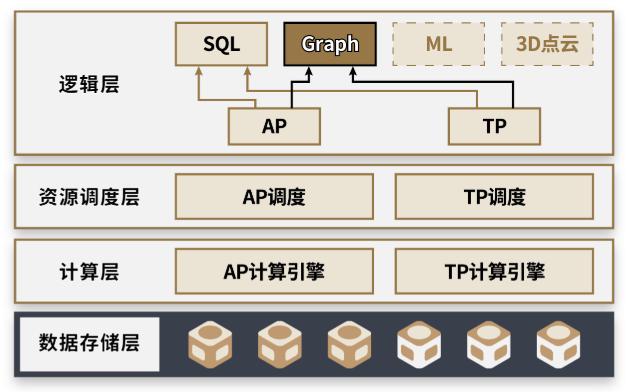 如图1所示,逻辑上,业务场景主要分为两类:联机交易OLTP和数据分析OLAP。HTAP数据库不仅支持使用SQL进行传统的关系模型计算,更是将图计算和AI建模纳入了逻辑计划中,可进行高阶计算。在数据存储层,通过行列混合的方式,按需支持OLAP和OLTP场景,这样就做到了一种存储架构兼容所有场景。