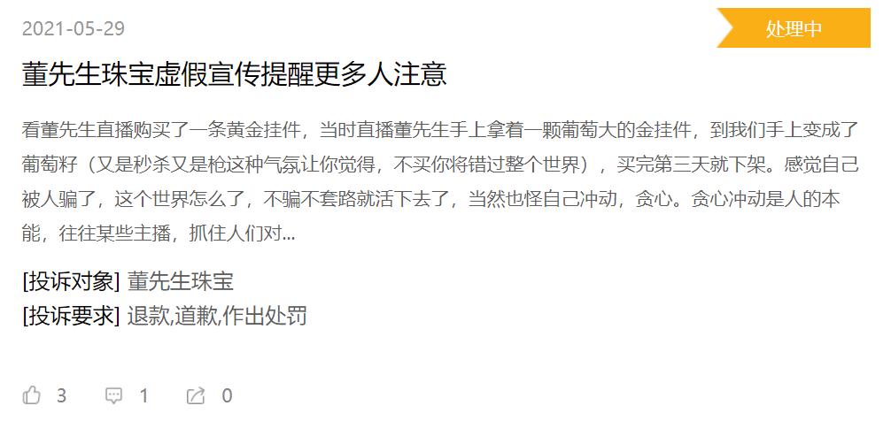 此前,包括“开菠萝财经”、“新腕儿”等媒体都曾对带货主播“董先生珠宝”的产品提出货不对板、割韭菜等质疑。