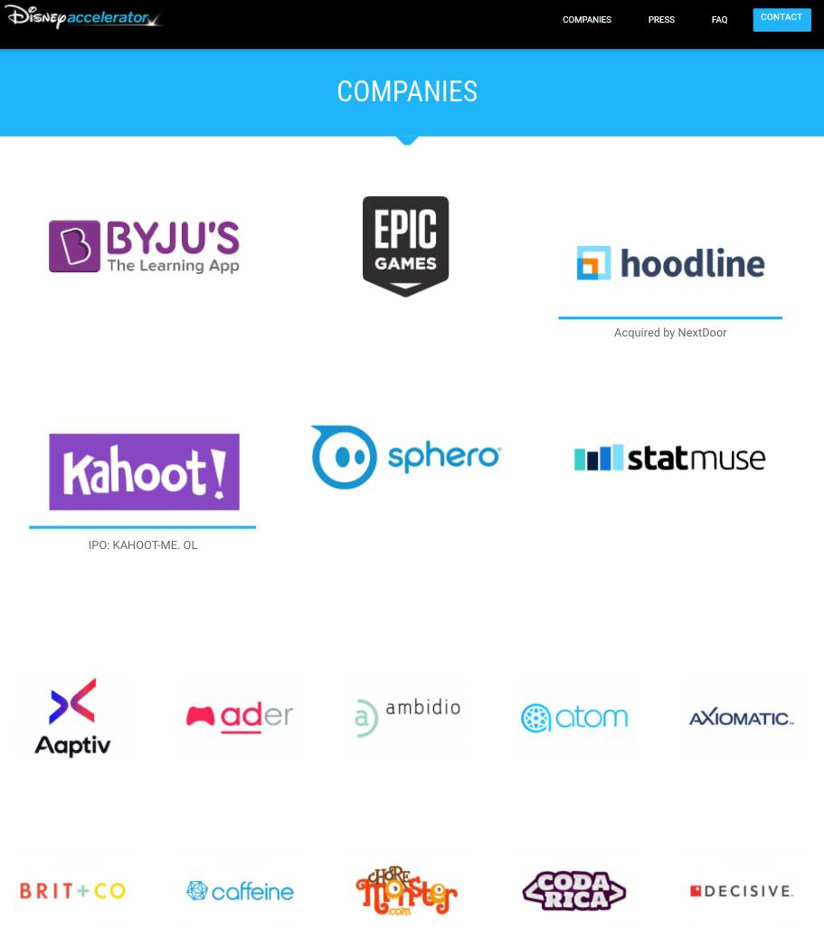 迪士尼加速器官网展示的46家公司(不包括本期在内)中有6家公司占据头部地位,它们分别是BYJU’S、epic games、hoodline、kahoot、sphero、statmuse。