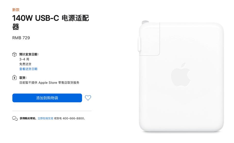 不过苹果在充电速度上加强了不少,今年的14英寸的MBP有96W的充电器,16英寸则标配140W充电器,苹果给出的充电时间显示,新款MBP在快充的加持下,可以在半小时内充入50%的电量。我也搜了一下这个140W的全新充电器,苹果官网卖729元。