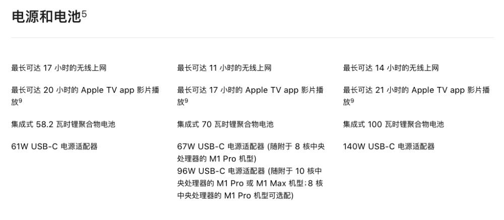 续航方面,在更换了全新的处理器、显示屏、音响系统等等元素之后,这一代的MBP在整体的续航上相比之前有所降低,之前搭载M1芯片的MBP 13连续播放视频时间可以达到20个小时,而此次14英寸的MBP减少到了17个小时,更大尺寸的MBP 16则可以播放21个小时。