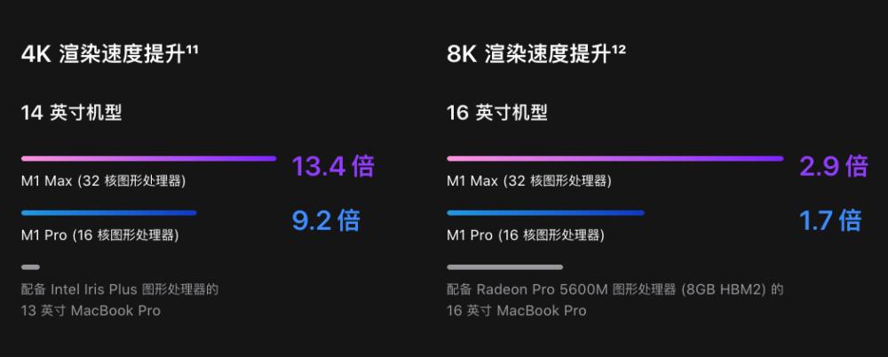 苹果官方给出了这样一组数据,在使用Final Cut Pro渲染一条4K视频时,14英寸MBP的M1 Pro的渲染速度是配备Intel Iris Plus图形处理器的13英寸MacBook Pro的9.2倍;16英寸MBP渲染8K视频的速度是配备Radeon Pro 5600M图形处理器 (8GB HBM2) 的16英寸MacBook Pro的1.7倍。