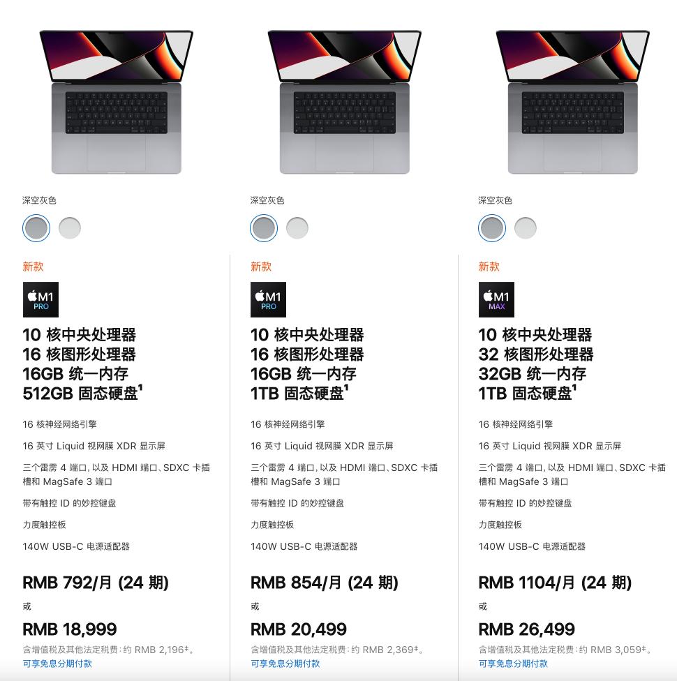 最后是价格,苹果在更新MBP新版的时候,并没有下掉旧版采用M1芯片的13英寸MBP,显然这件事不简单。而在价格公布之后,果不其然,想要买一台M1 Pro版本的MBP,你最少要花14999元,如果想要体验下16英寸M1 Max的皇帝版,你要花26499元。