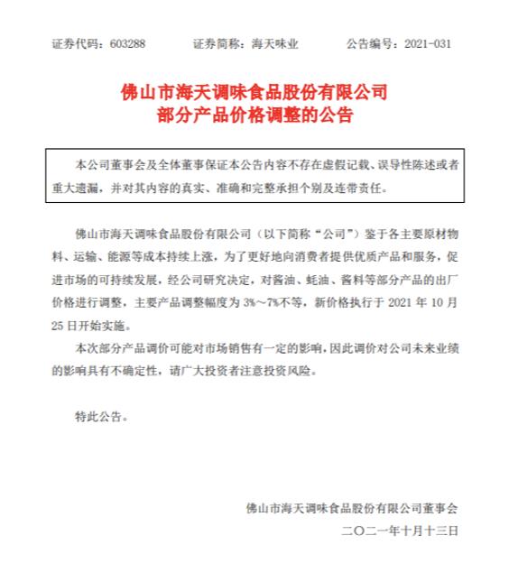 但最近,海天味业的日子也不好过,因为涨价问题站在风口浪尖上。10月12日晚间,海天味业发布公告称,公司将对酱油、蚝油、酱料等部分产品的出厂价格进行调整,主要产品提高幅度为3%-7%不等,新价格执行于2021年10月25日开始实施。