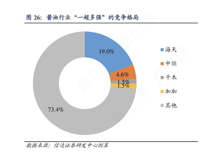 酱油行业当前处于“一超多强”的局面,据信达证券研发中心测算,我国酱油行业的竞争格局分为三个层次,一是全国性品牌,如海天味业、李锦记等,市场区域涉及全国多个省份;二是地方性强势品牌和外企品牌,如四川的千禾、华中的加加、山东的欣和等,外资品牌则以味事达等为代表;三是小规模工厂或家庭作坊,一般采取自产自销,产品价格低廉,主攻农村、乡镇市场。