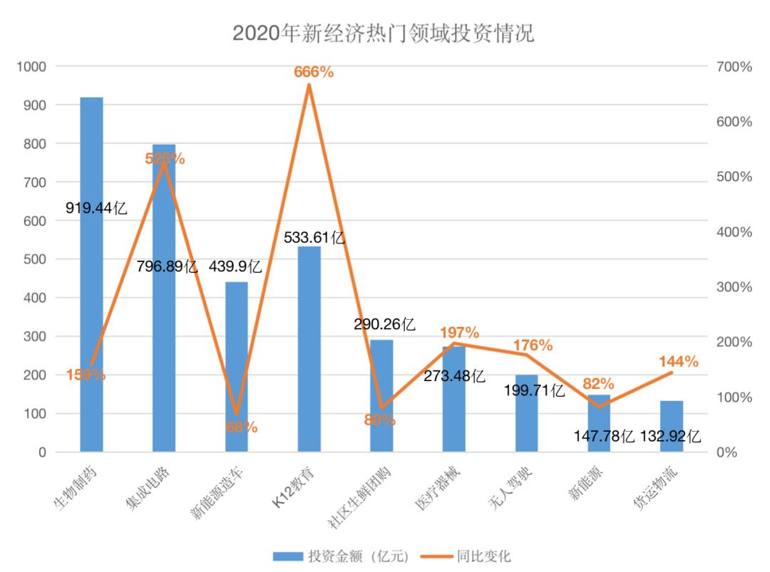 2020年最热门的投资行业是医疗健康,共有838笔投资、融资总额1745亿元,占比19%;其次是新工业领域,有772起事件,占比18%;企业服务领域有695起投资事件,占比18%;这三大领域占据了新经济领域投资事件的半壁江山。