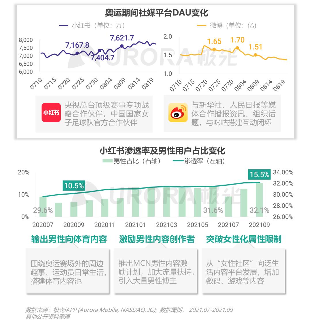 小红书及微博作为社媒平台,承担场外内容和资讯的联动传播作用,就DAU而言,奥运给微博带来更加明显的用户活跃度提升,微博更能迅速传达资讯,聚变话题,渲染大众情绪