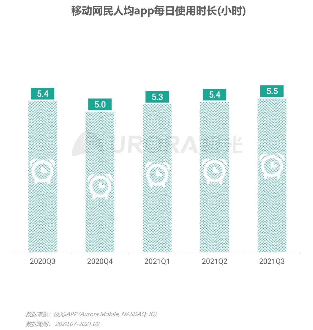 2021年第三季度,移动网民人均app单日使用时长达5.5小时,比上一季度略有提升,较去年同期增加6分钟,同比增长率为1.7%,后疫情时期移动网民的数字化生活习惯正在深入养成