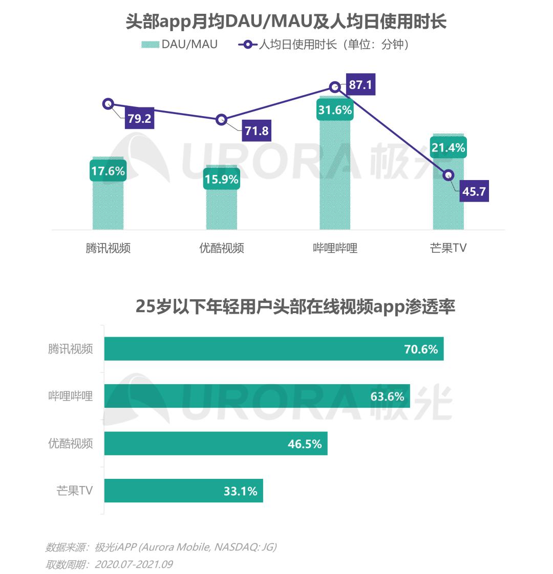 2021年Q3,哔哩哔哩表现抢眼,用户粘性指标DAU/MAU与人均日使用时长为行业最高,分别为31.6%与87.1分钟