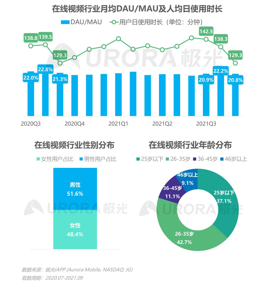 对比2020年Q3,行业DAU/MAU均值同比下降0.72个百分点,行业整体发展稳定;Q3行业人均使用时长均值达到136.7分钟