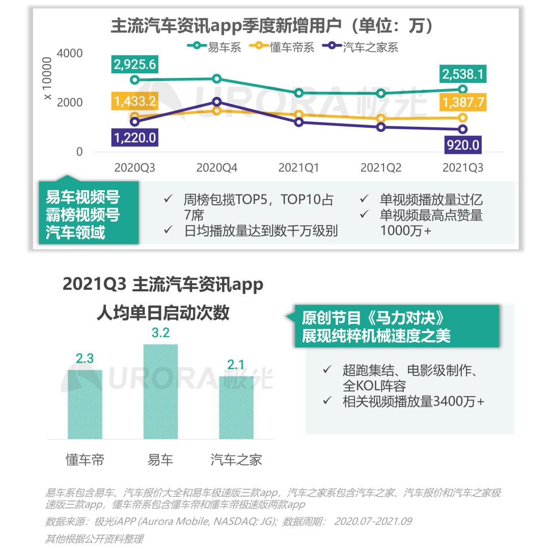主流汽车资讯app中,易车系依然保持强劲的用户增长态势,2021年第三季度新增用户达2538万,大幅领先竞争对手。易车强化对于移动入口的争夺,积极布局视频号,凭借优质内容获取大量用户,牢牢占据视频号汽车内容龙头位置