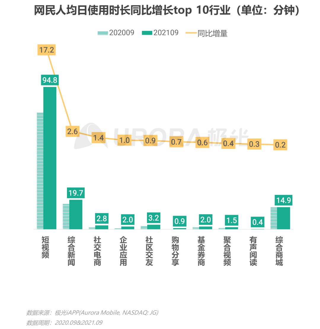 在时长方面,网民使用时长占比最高的短视频行业继续保持最高的同比增长,较去年9月增加17.2分钟,全国平均每个网民单日观看短视频达到94.8分钟;其次是综合新闻和社交电商行业,网民平均单日使用时长同比增长分别为2.6和1.4分钟
