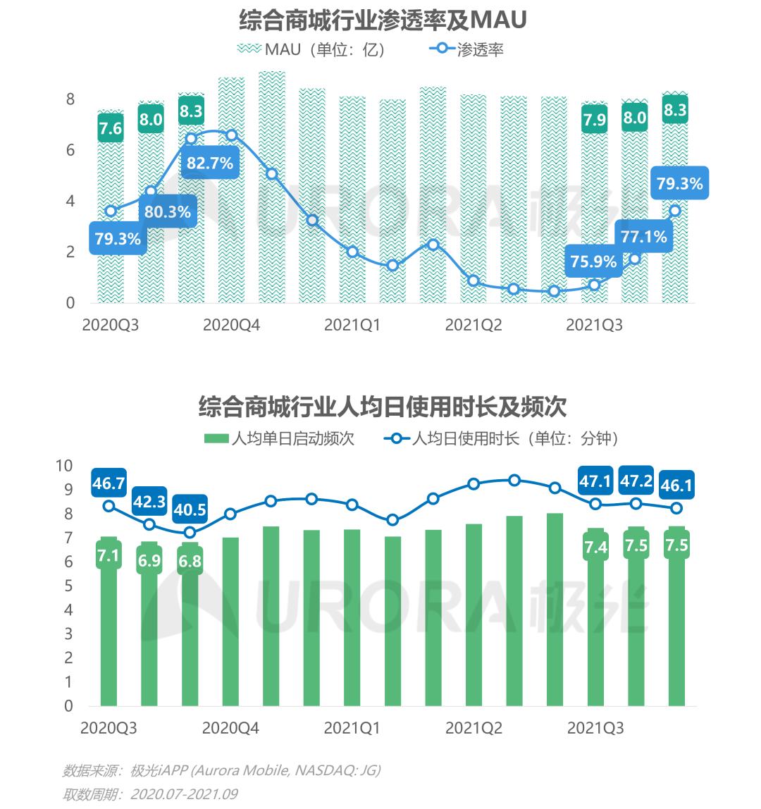 2021年Q3,综合商城行业人均日使用时长均值达到46.8分钟,同比2020年Q3增加8.4%;行业人均日启动频次方面同比2020年Q3上升7.7%,达到7.5次