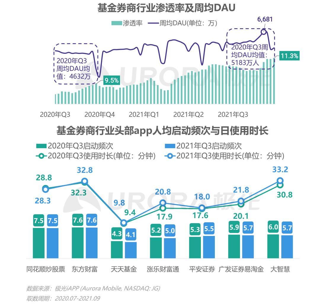 券商行业传统盈利点的佣金制度正逐渐消失,加之2021年我国证券行业对外开放提速,刺激行业加快改革与发展,头部券商IT投入的不断加码,移动互联网+证券经纪业务正逐渐成为行业主流模式。2021年Q3基金券商行业周均DAU为5183万人,同比增长11.9%;得益于资本市场的良好趋势,9月第一周行业周均日活突破6681万人,达到季度峰值;在渗透率方面,2021年Q3渗透率达到11.3%,同比2020年Q3上涨1.8个百分点