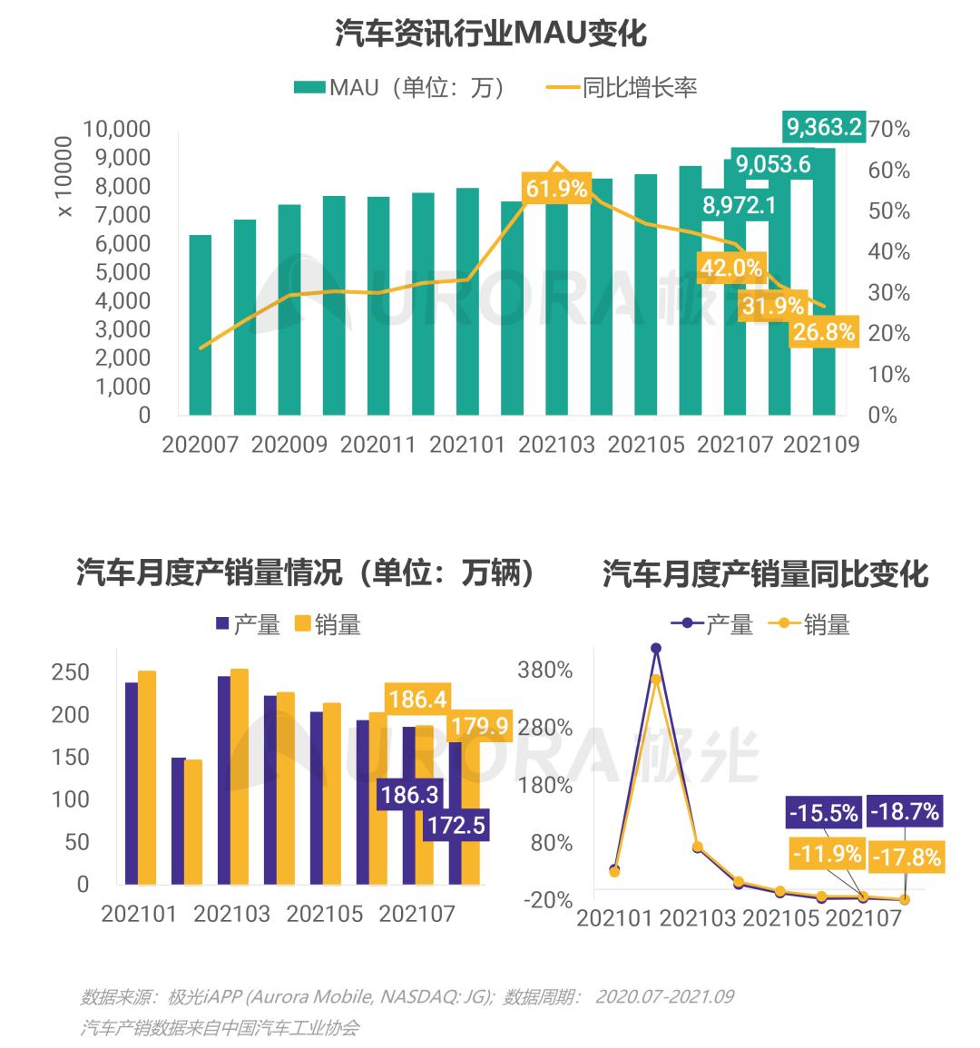 2021年第三季度汽车资讯行业MAU继续上行态势,9月月活达9363万;本季度同比增长率平均保持在30%以上,7月月活较去年同期上涨42%,行业仍处于成长期,发展前景良好