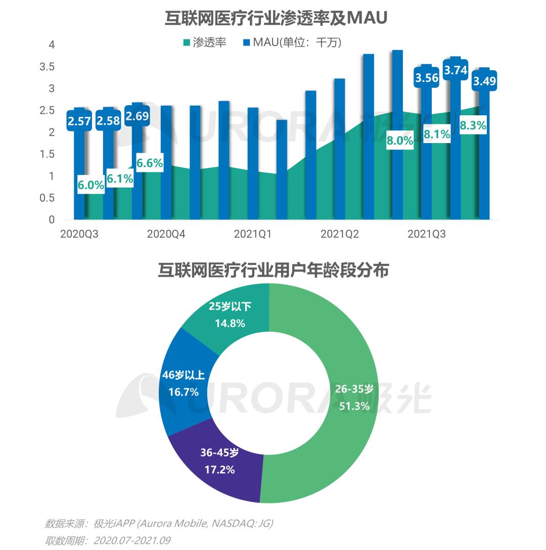 后疫情时代互联网医疗行业仍保持高月活,Q3行业月活人数均值达到3596万人,同比增长37.6%;渗透率峰值达到8.3%,同比增长1.7个百分点,行业整体处于高速发展期