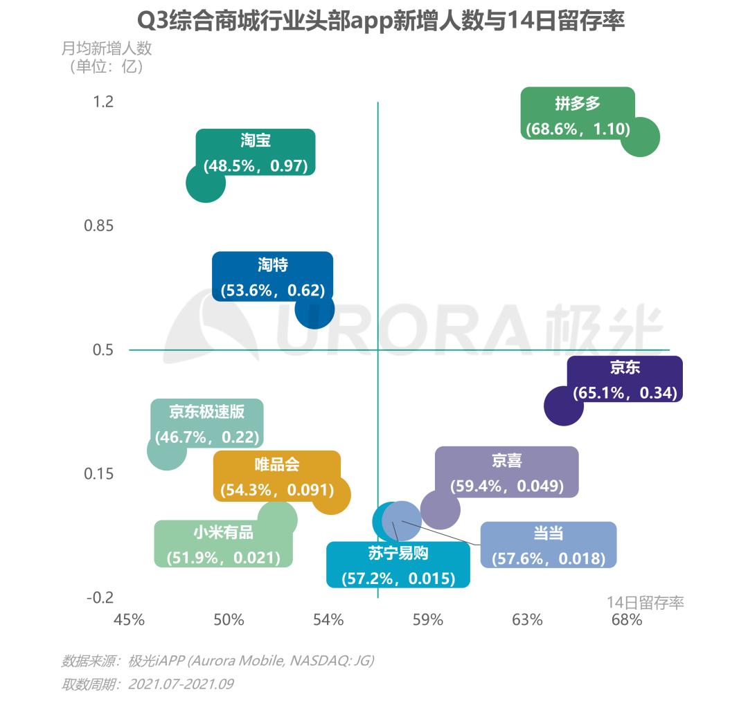 综合分析应用季度新增人数与14日留存率的关系,行业头部app整体态势呈现四个维度。其中四个维度分别是高增量、高留存为首的拼多多;高增量、低留存为代表的淘宝与淘特;高留存、低增量为代表的京东、当当、京喜与苏宁易购;低留存、低增量的唯品会、京东极速版以及小米有品