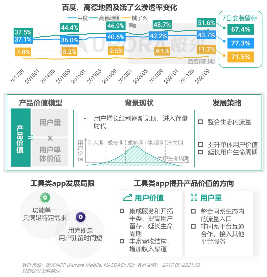 基于搜索、外卖及导航工具属性,抢占流量入口的百度、高德地图及饿了么已进入成熟期,用户增长放缓,用户规模保持平稳,但得益于疫情加速建立数字化的生活习惯,产品有望借转型二次“成长”