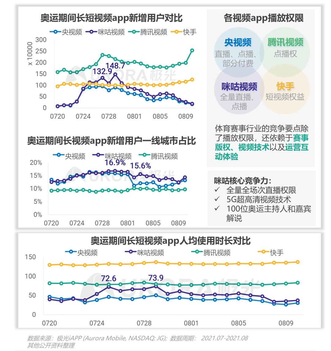 奥运期间,获得全量直播权的咪咕视频新增用户超越快手,最高达149万,人均使用时长也逼近腾讯视频;相比央视频和腾讯视频,咪咕收获更多来自一线城市的新增用户