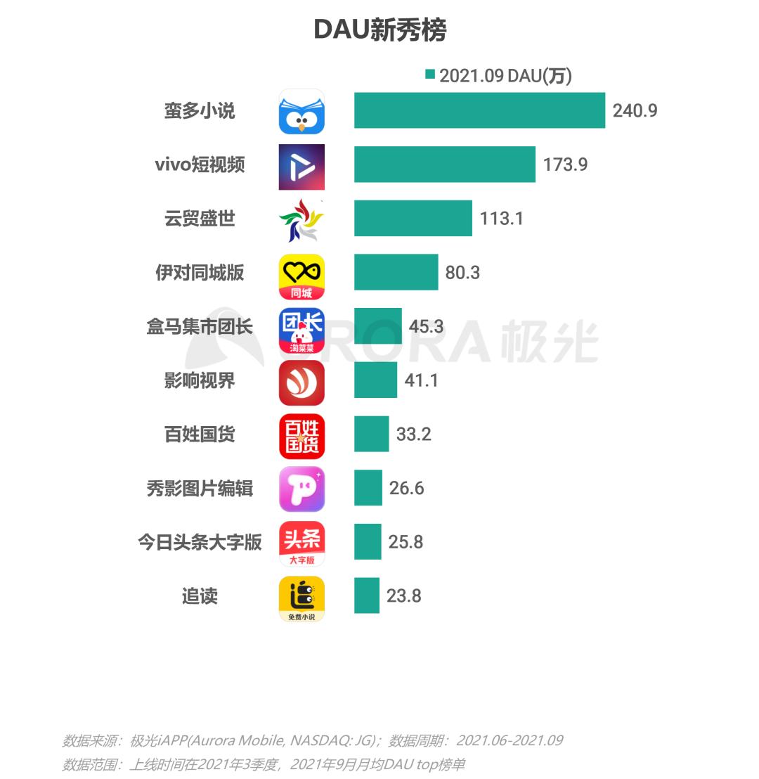 2021年第三季度上线的在线阅读app蛮多小说排名第一;卖家工具app云贸盛世和盒马集市团长上榜;其余入围的应用包括在线视频app vivo短视频、社区交友app伊对同城版、短视频app影响视界、综合商城app百姓国货、拍摄美化app秀影图片编辑、综合新闻app今日头条大字版以及在线阅读app追读