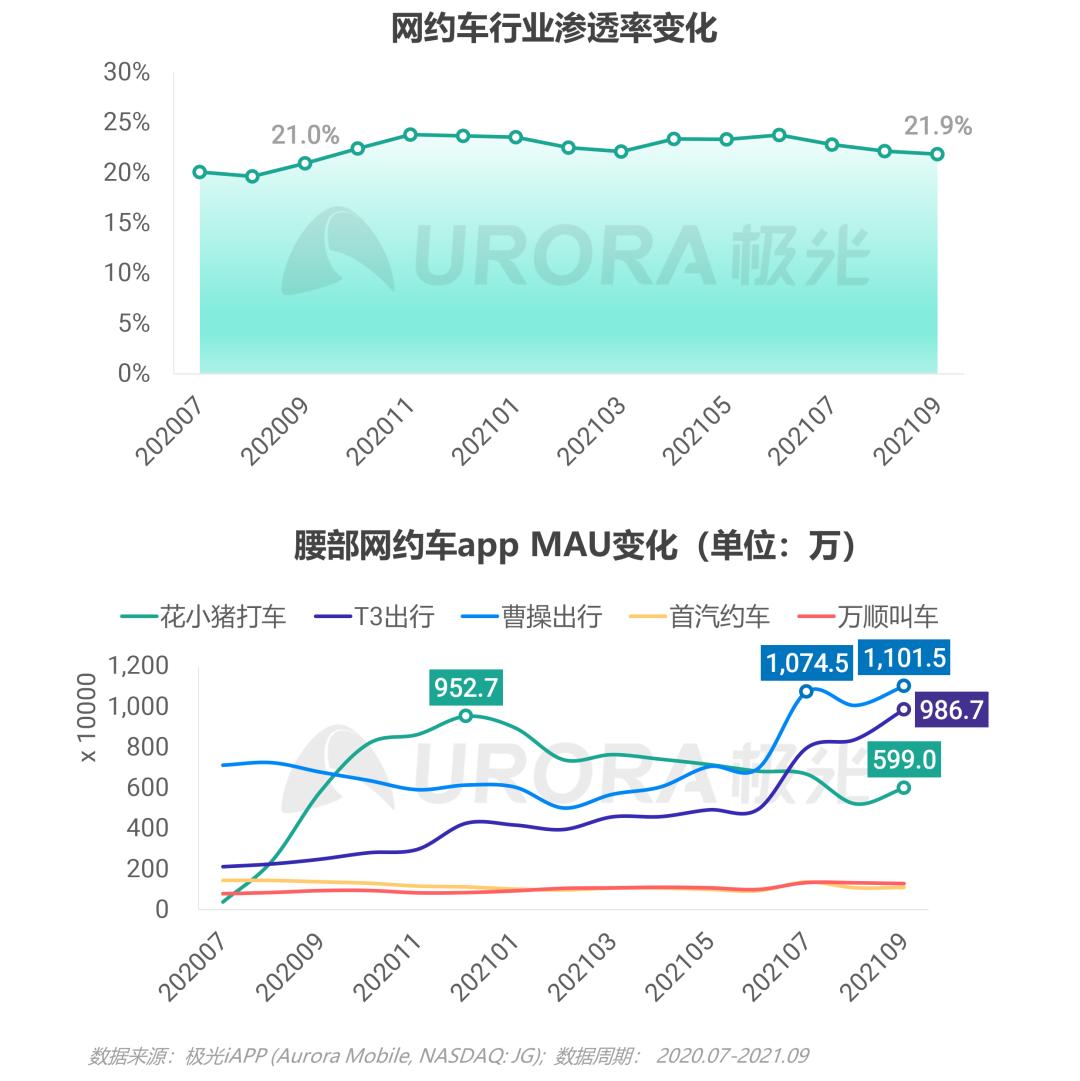 自7月行业头部遭遇挑战以来,腰部玩家再次获得争夺用户的机会,曹操出行及T3出行增速大幅提升,到三季度末曹操出行MAU已超过花小猪,达到1101.5万,同比增长率高达62.5%,在腰部网约车平台中位列第一