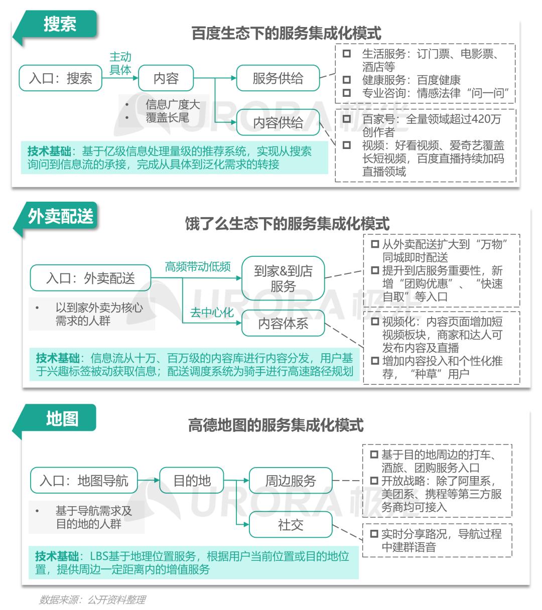 就服务链路的长度而言,饿了么及高德覆盖特定需求人群,百度从用户主动提出的搜索询问出发,通过内容转接,延伸至更广泛的需求场景