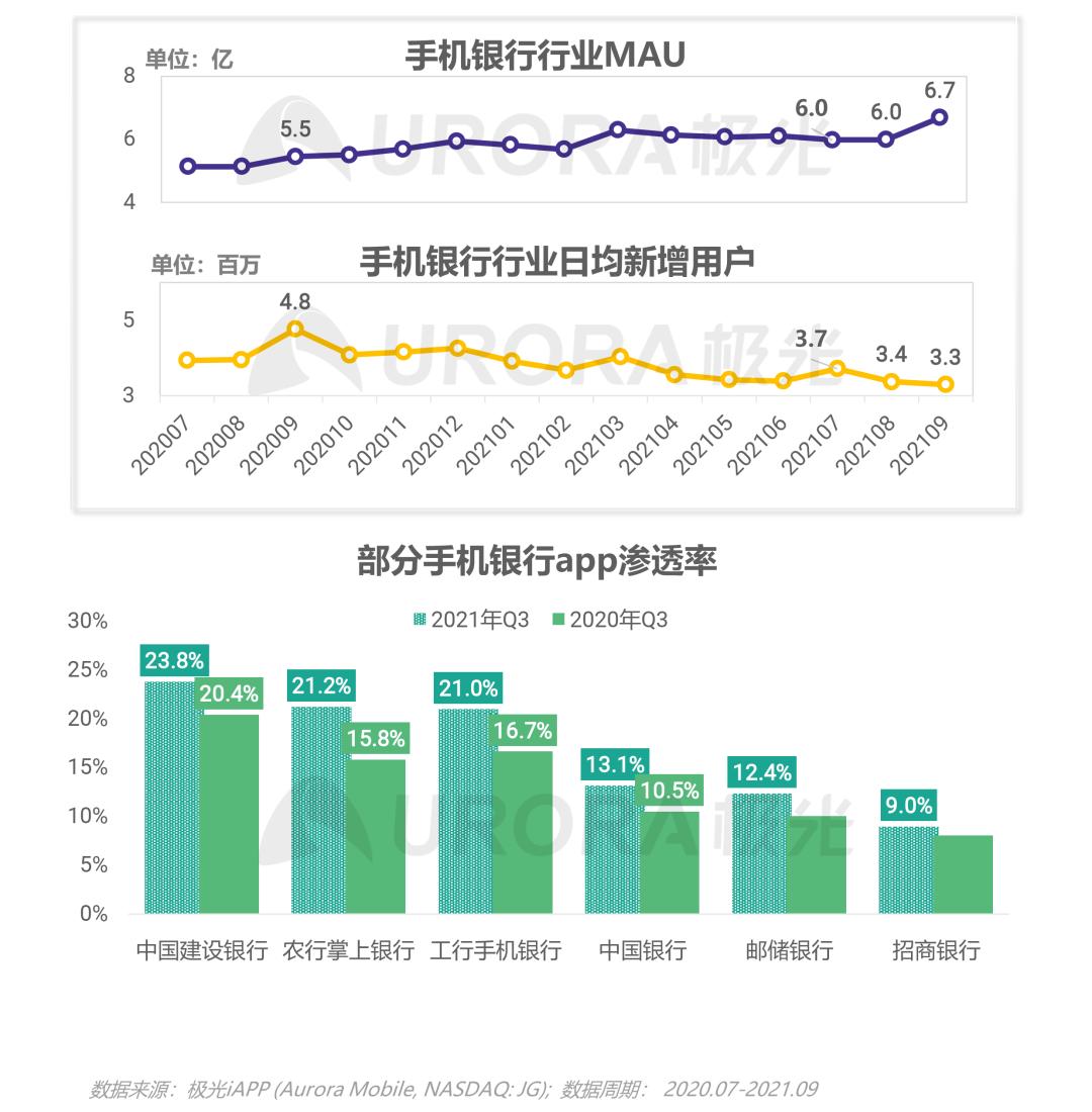 2021年第三季度,手机银行行业MAU保持稳步上升,9月MAU达6.7亿,同比增长22.6%;用户增长保持稳定,7、8、9月日均新增用户数分别为370万、340万和330万,较去年同期略有下跌