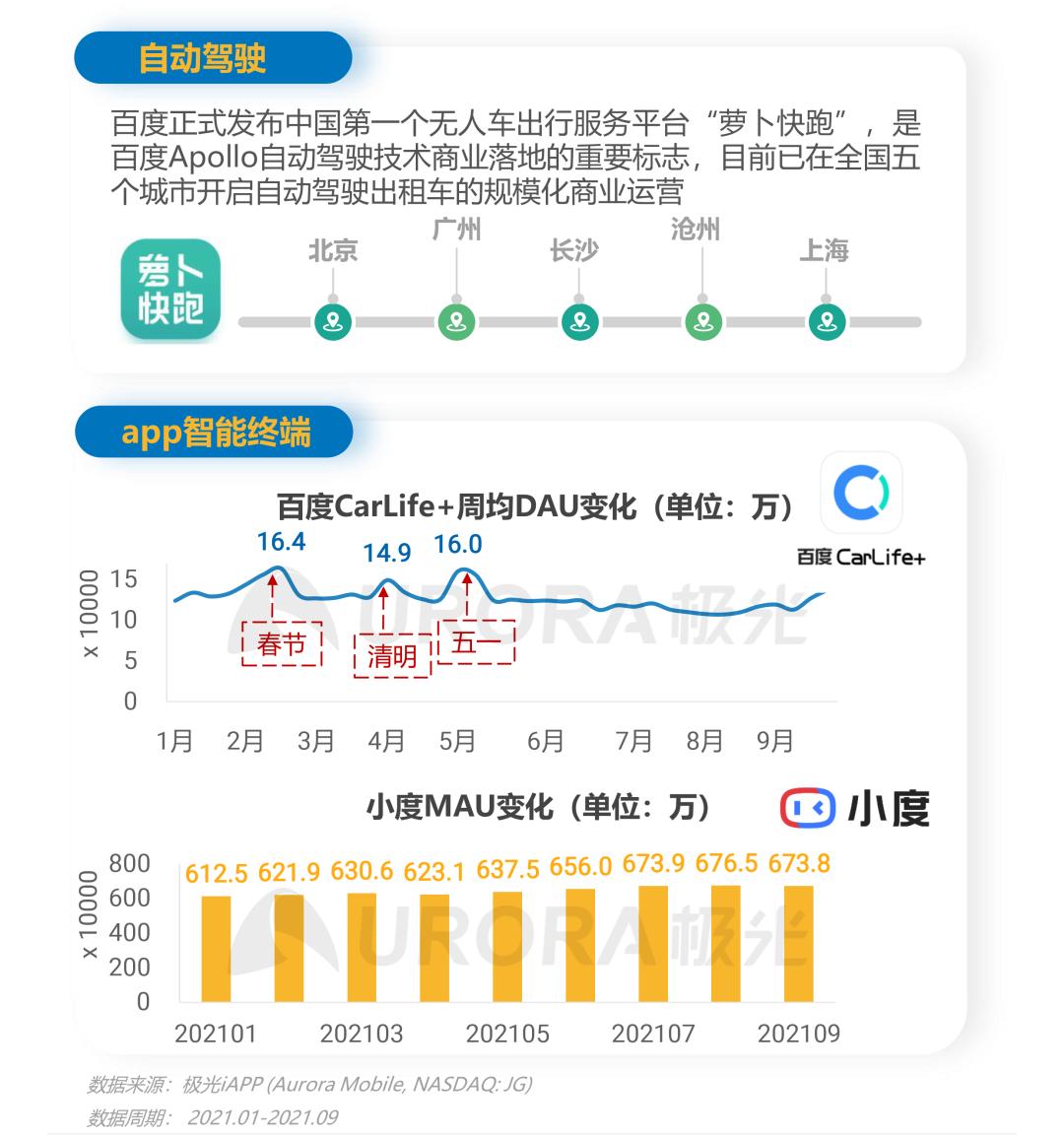 在生活领域,车载应用百度CarLife+成为用户节假日自驾出行的旅途伴侣,在小长假迎来明显的周均DAU高峰,满足路上导航、听歌和安全通话等需求;围绕家庭生活场景智能化的控制中枢小度渗透到更多家庭用户,MAU保持增长,9月MAU已达673.8万
