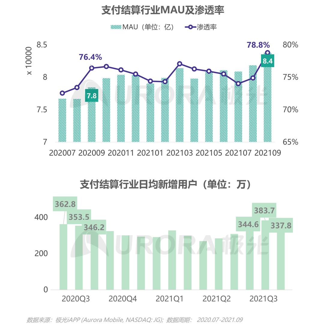2021年三季度末,支付结算行业月活用户数以及覆盖率均达近一年来的峰值,MAU达8.4亿,相较去年同期增长7.7%,而覆盖渗透率则贴近八成,较去年9月上升2.4个百分点,电子支付消费模式的普及率再攀新高