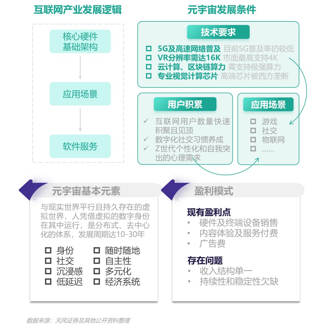 从互联网产业发展逻辑来看,目前5G、VR、区块链及芯片等方面的要求尚未达到,且暂时只围绕游戏和社交开发应用场景,加上盈利模式暂未明朗,因此还处于概念性的雏形阶段