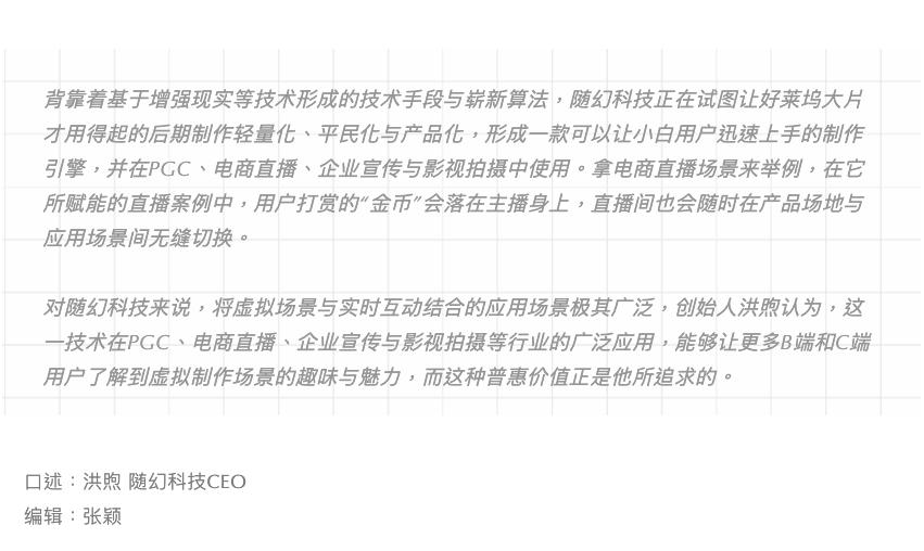 在创立随幻之前,我一直在想一个问题:能不能进一步降低门槛,让C端小白用户也能使用虚拟现实技术?在抖音出现之前,视频都是专业的人在拍摄,而如今每个人几乎都有能力拍短视频,这其实是我们的最终目标。之前多次案例的成功让我开始思考技术的应用场景和方向,最后将电商、教育、娱乐和to B作为我们可以尝试的应用方向。目前电商将是随幻最重要的服务领域,影视剧、发布会制作为代表的线上娱乐为辅,线上教育与企业活动板块也在积极增长中,随幻选择的每个市场机会都有真正的需求,有望在短期之内形成线性增长。