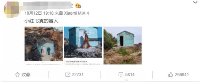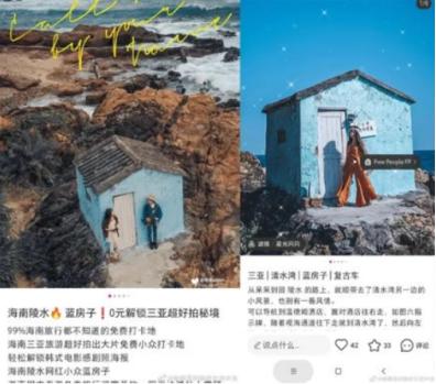 在种草文里,蓝色的小屋、嶙峋的石头,壮阔的大海,画面看起来小资又浪漫,标题写着是“海南陵水蓝房子,0元解锁三亚超好拍的秘境”。