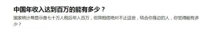 但现实是,根据国家统计局的数据,中国年入百万以上的人只占总人口的0.05%,按14亿计算也就70万人左右,有一些统计平台觉得这个太过保守,但其中最乐观的统计也不超过500万人。