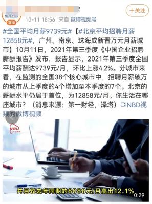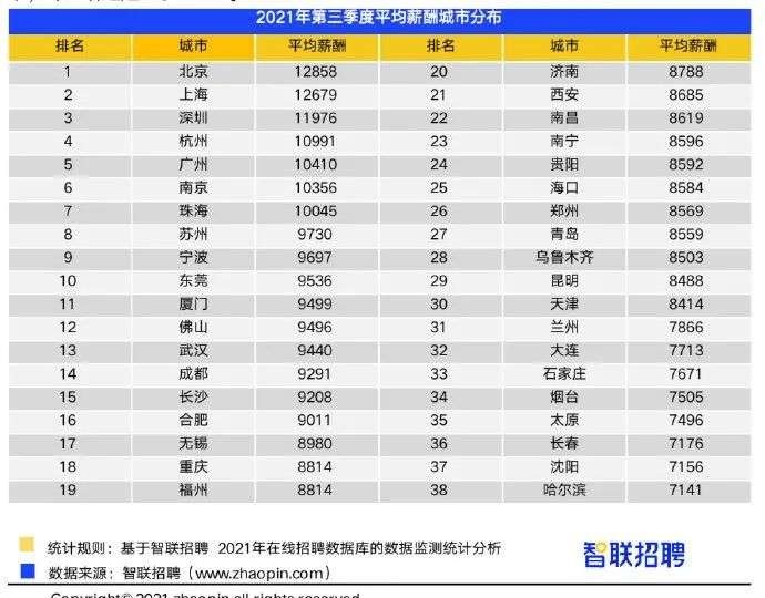 该平台统计的2021年第三季度各城市的平均薪资水平中,北上广均在12000元左右,逼近一万的也大有人在。