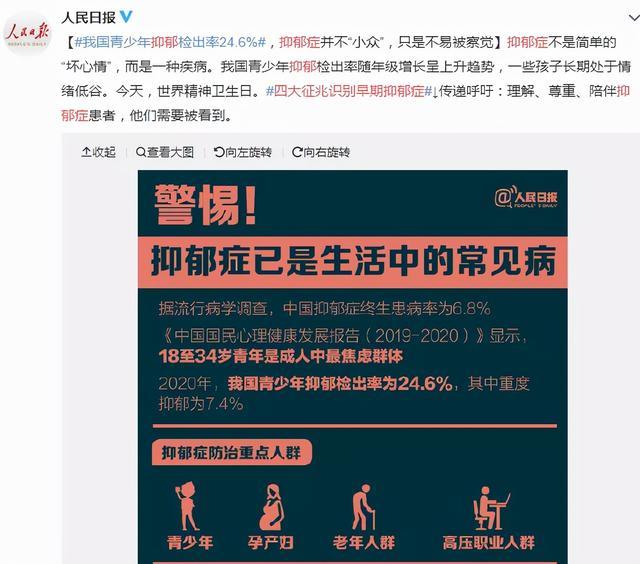 报告显示,我国青少年抑郁检出率为24.6%,其中,处于18-35岁之间的青年有四分之一是抑郁的。