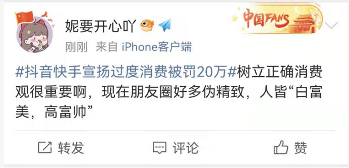 特别是近期以来,越来越多类似的现象被注意到,比如抖音快手因宣扬过度消费被罚。