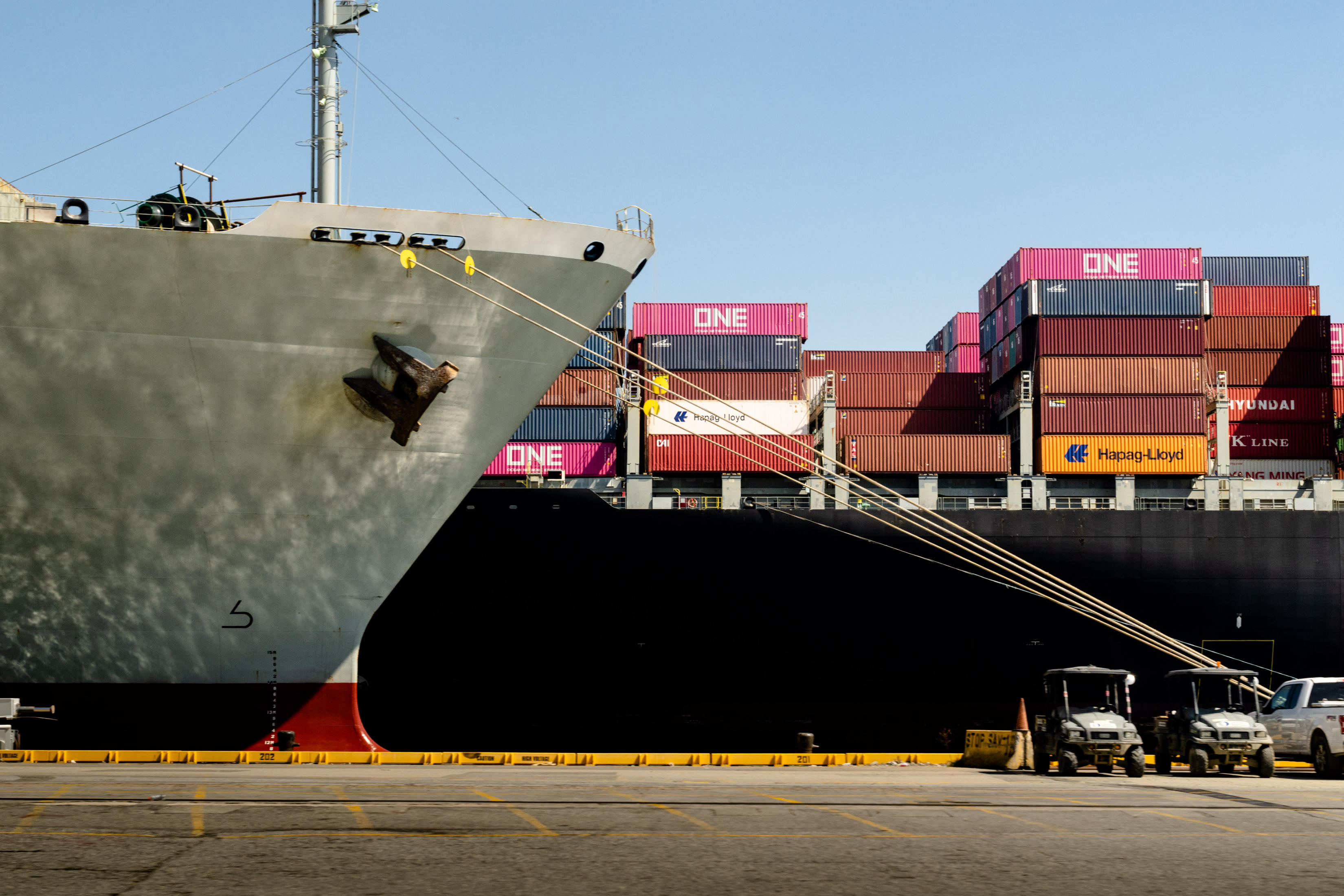 他话音未落,又有一艘货船悄无声息地驶向一个开放的泊位。这是一艘长1207英尺(约368米)的“视明轮(Yang Ming Witness)”货船,甲板上堆满了集装箱,里面塞满了服装、鞋子、电子产品和其他亚洲工厂制造的货物。