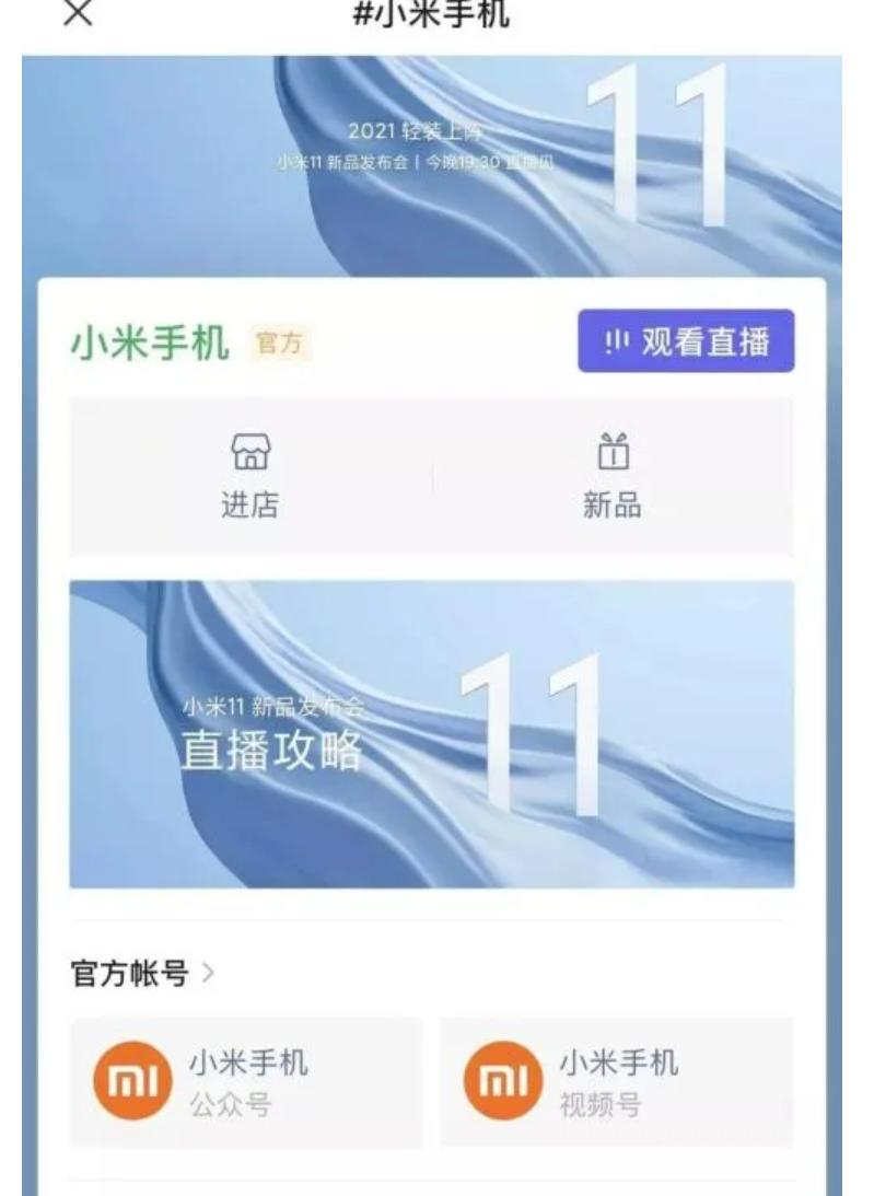 在当时,只要你通过微信搜一搜搜索小米、小米发布会等关键词,小程序、公众号、视频号、官方商城等接口就会依次排开等待你的宠幸,微信为这位大客户提供了非常完整的配套服务。